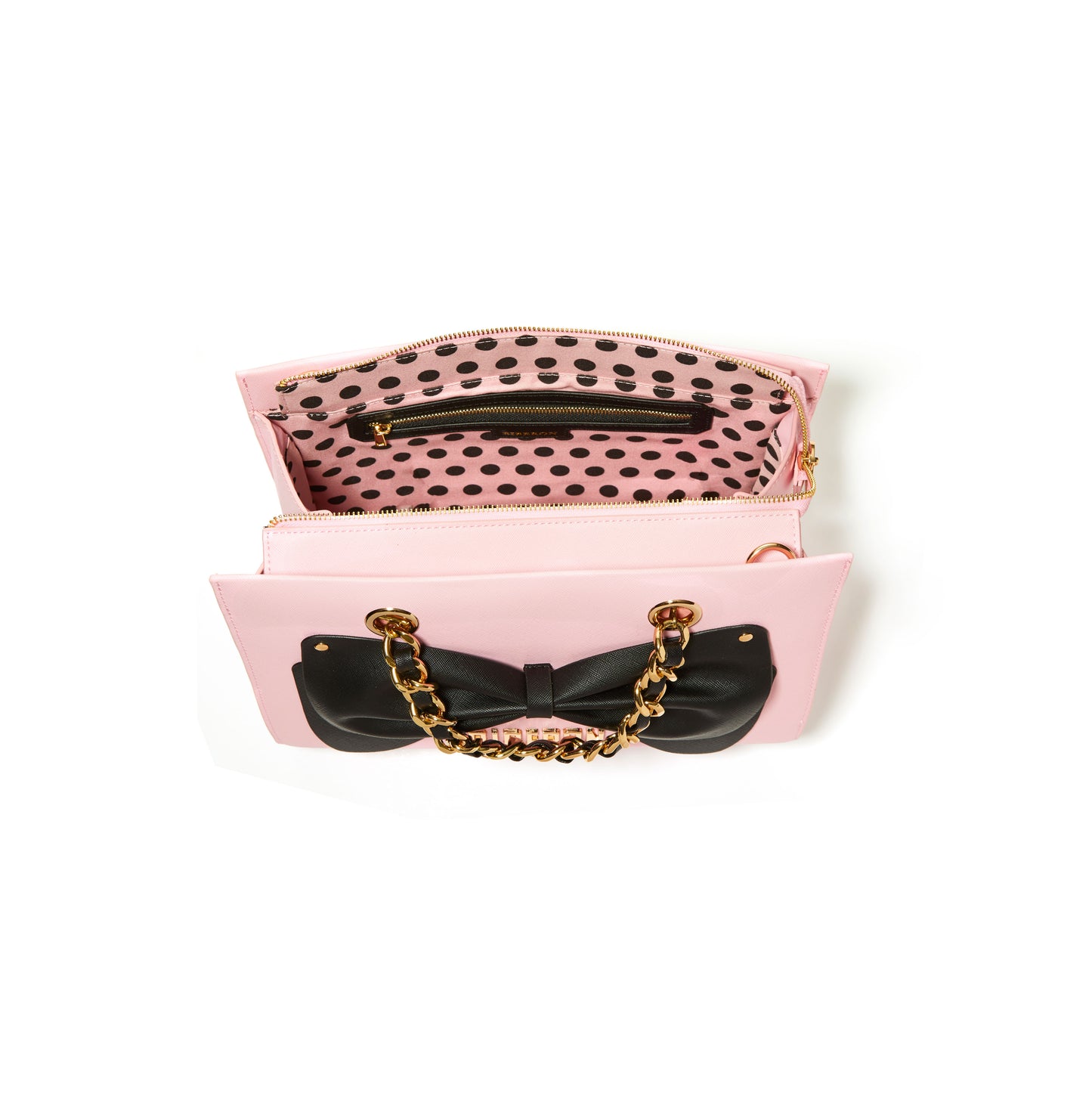 Inspired by iconic pin-up Bettie Page, here is our "Bettie" satchel bag! Be sexy, classy, cute and efficient with a bag that doubles as a work bag as well as evening bag. Polka dots line the interior for a fun pop and the chain accents function as handles when not carrying as a crossbody.